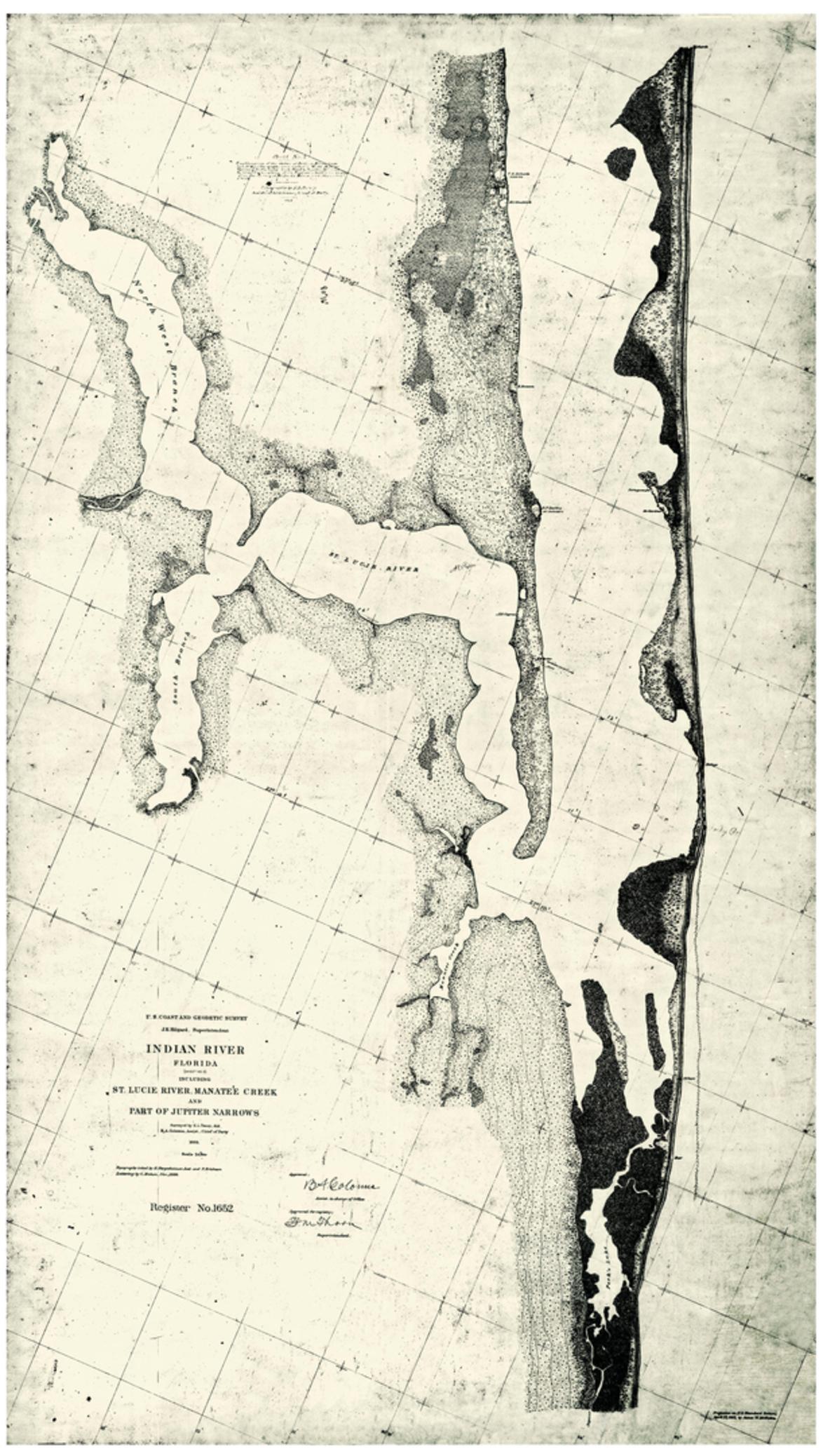 On the west Shore of Indian River the ground rises from five to eighty feet above the level of the ordinary height of water in Indian River the higher ridges give quite a pretty land fall when seen four or five miles off shore quite overtopping the land and forest between Indian River and the ocean. On the east shore of Indian River and between it and the ocean the mangrove swamp is about on a level with the water in the River at ordinary stages and near the beach is from 3 to 15 feet above ocean high tide. I had a signal scaffold 45 feet high on top of a hill 82 feet high on the West Side of Indian River (Blue Hill?) from this scaffold I had a fine view of the county to the westward which consisted of numerous parallel ridge of sand with intervening saw-grass ponds the major axis of all of which extended in a northerly & southerly direction. Cattle-men that I met at the St. Lucie P. O. informed me that it was a succession of these ridges back to Okeechobee and that the old government wagon road which ran north and south and was back about 4 to 12 miles from the river was still passable and ran for the most of the distance along such ridges. Nearly all of this country rest on a foundation of marine conglomerate called Cochina [coquina] which is at various depths but occasionally crops out rising from 3 to 5 feet above mean ocean tides. This cochina differs very much in structure from that of Beaufort N. C. and other places north of here, large shells are seldom found in it and some of it presents the appearance of course white or yellow sand stone. When burned it makes a fairly good shell lime and when wet can be readily cut into building blocks with an axe. The sand of which the soil is almost exclusively formed is white or yellowish, it underlies all of the streams, saw-grass ponds, mangrove swamps & two or three feet generally bringings (?) the white sand even in mangrove and other swamps. It is impracticable to dike any of the low grounds because the water on a rise would come in from the bottom. — Whenever pine is indicated there will be found a growth of underbrush of various kinds and ranging in height from 1 to 10 feet. The pine timber itself is of little or no value being of stunted growth and the underbrush is scrub oak, whorttlebun (?), low saw-palmetto etc. etc. Where hard wood is depicted, except the mangrove swamps, the land is always best for cultivation, such hard wood land is called “Hammock-land by the natives and seems to owe its fertility to the fact that cochina lies near the surface and like an impermeable clay holds those chemicals that are gathered from the decaying vegetation, among the trees growing in these hammocks are those locally known as Palmettos, Mastics, Rubber trees, Live Oaks, Iron wood trees, the Crabwood trees and a great variety of others. There are various course grasses growing along the Ocean shore, and several varieties of running cactus, prickly pear in se and mixed in every when, a decided feature on the level sand wastes and elsewhere along the ocean side and occasionally west of the Indian River is the Scrub palmetto, a species of palm that although it has a trunk from 4 to 8 inches in diameter and from 3 to 20 feet in length runs along the ground like a vine and among them progress is very difficult for their trunks cross each other in mast confusion and their leaves are just about 5 feet high and have sharp edges. On the west side of the river among the pines and in the lands along the edges of the saw grass ponds there was nice tender grasses on which deer feed, and I never ate more delicious venison than here. The Indians of whom there are 3 or 400 back in the Glades, remnants of the Seminoles, always burn off the underbrush as much as they can about January or February. The saw grass ponds to which I have alluded are of fresh water generally very shallow and cut up by narrow sloughs or streams, these streams are seldom over 4 feet deep and have hard sandy bottoms on which various water grasses grow. The sawgrass itself has generally in the dry season only 3 or 4 inches of water about its roots but in the wet season the water rises 2 or three feet, the blades of this grass are from 3 to 10 feet long, about an inch wide and their edges are serrated, touch and very sharp. They rapidly cut out the clothing. If there is any hotter place than one of these saw grass ponds when the sun shines down and the myriads of mosquitoes swarm in our face stinging by tens and twenties, I hope it is not on top of the earth. Wherever these saw grass ponds run parallel to the River and within a mile or so of it excellent water can be had had by setting a flour barrel at the river side along the foot of the bluff. But on the east side of Indian River and between it and the Ocean good water is unknown for when fresh it is so strongly impregnated with lime that it is far from wholesome. —The mangroves grow to a greater height here than elsewhere within my experience. The natives divide it into two varieties, the Black and the red. I had the black mangrove cut down from one of the lines of sight that measured 85 feet from roots to top. When season[ed] the mangrove wood looks much like mahogany and is very hard, it takes a high polish. When burned the ashes are very strong in potash, a fact that may prove of value some of these days because the trees are so assessable. The old Gilbert’s Bar entrance, now closed, is shown on this sheet. Whenever the salt and fresh waters meet the mangrove flourishes and such has been the case at Gilbert’s Bar. Once fine oysters grew there and all kinds of fish belonging in these waters were abundant but since the inlet closed the oysters have died and the fish are gone except a few bass and catfish. Just outside however and along the old Gilbert’s Bar (Cochina Reef) there are lots of them Barracuda, Pompano, Bluefish, Cavallies, Green Turtle, Mullet, Sea Bass and a beautiful fish much resembling our Spanish mackerel b